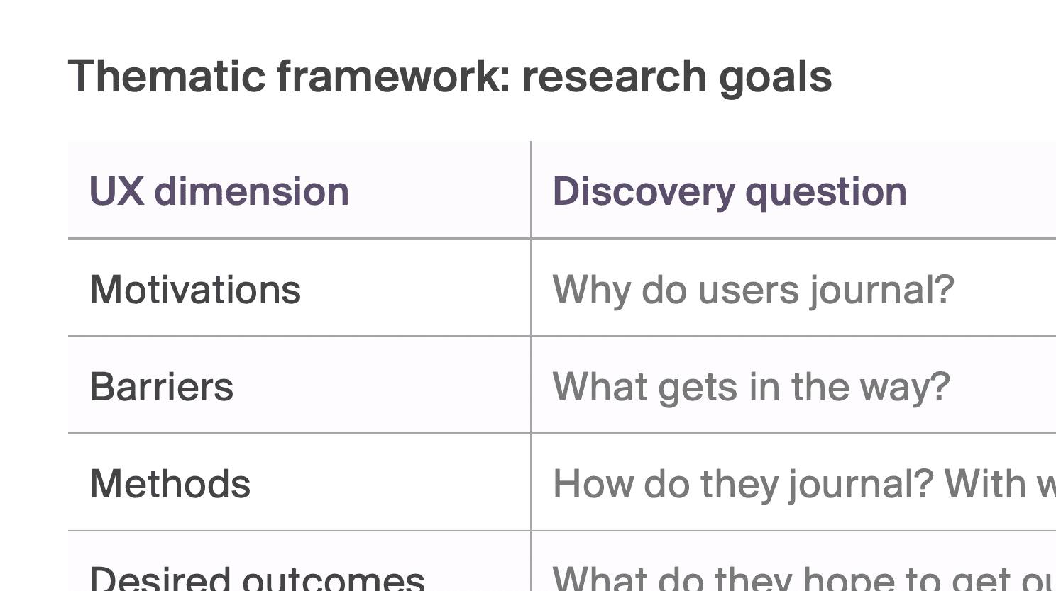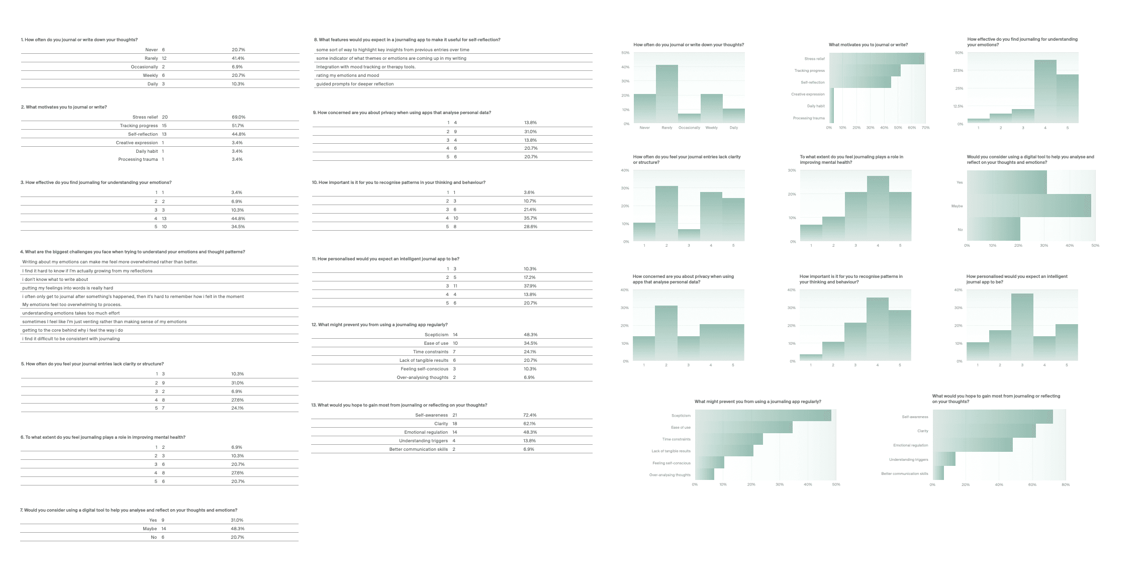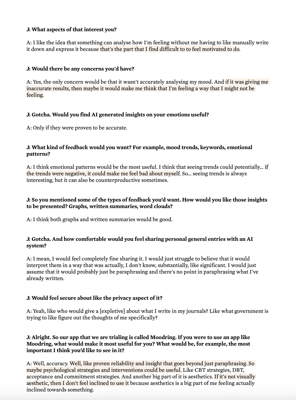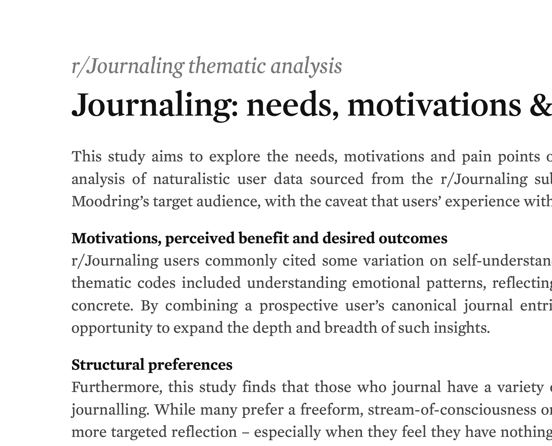 To better understand Moodring’s prospective users, I carried out a series of formative user research consisting of a survey, one-on-one interviews and a thematic analysis of the r/Journaling subreddit.