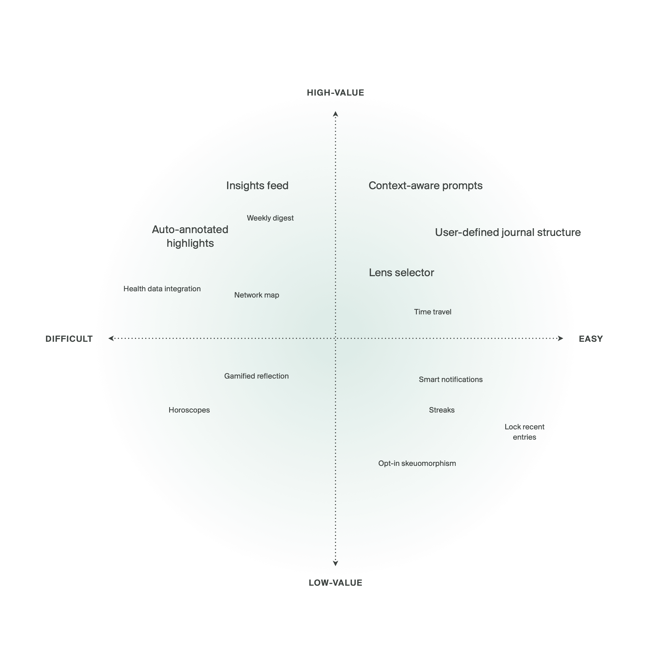 I began Moodring’s formative market research with a competitive analysis of existing journalling and mental wellbeing products. I mapped these tools across two axes: degree of personalisation and depth of reflection supported, approximating value and experience respectively.