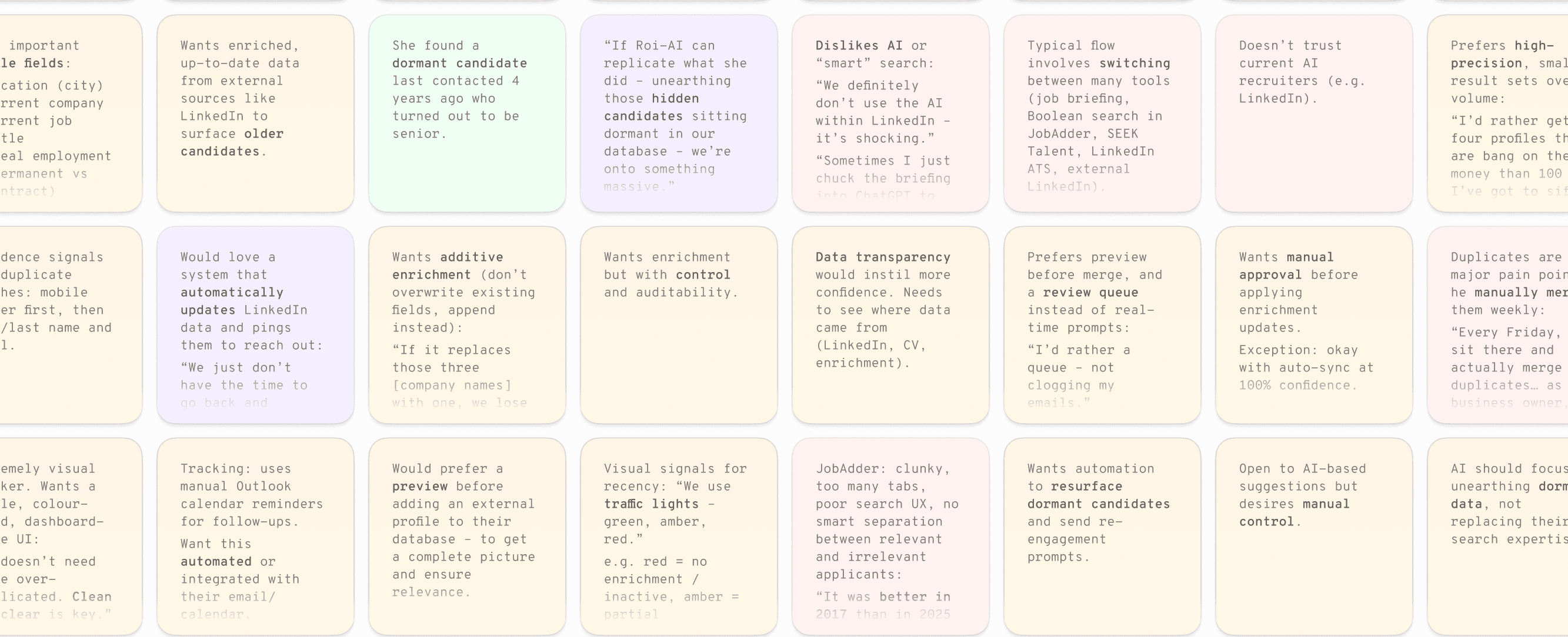 We spoke to a number of Roi-AI users within the recruitment industry to better understand their needs, motivations and frustrations. We asked open-ended questions about their experience with the current product as well as about their workflows as a whole. From our conversations, some common themes emerged: