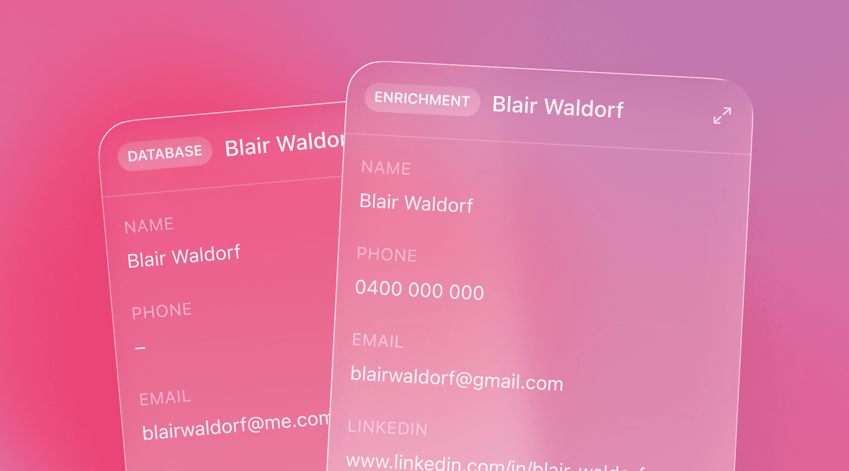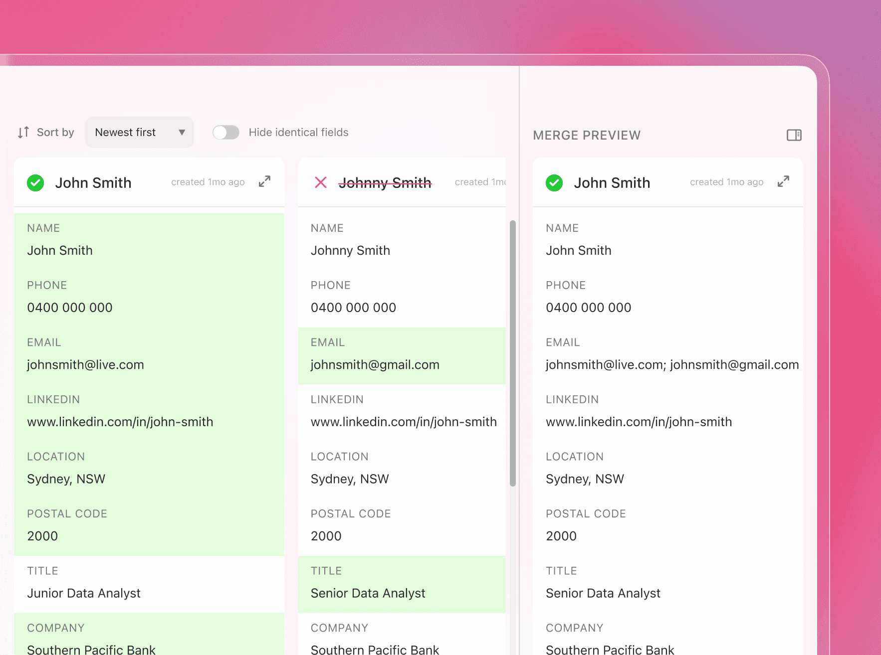 A pending match is represented by two profile cards – one containing the user's current database profile, and the other containing the corresponding enrichment data for the user to action. These cards intuitively display all relevant match data and enable selection-based control over proposed syncs, merges and links.