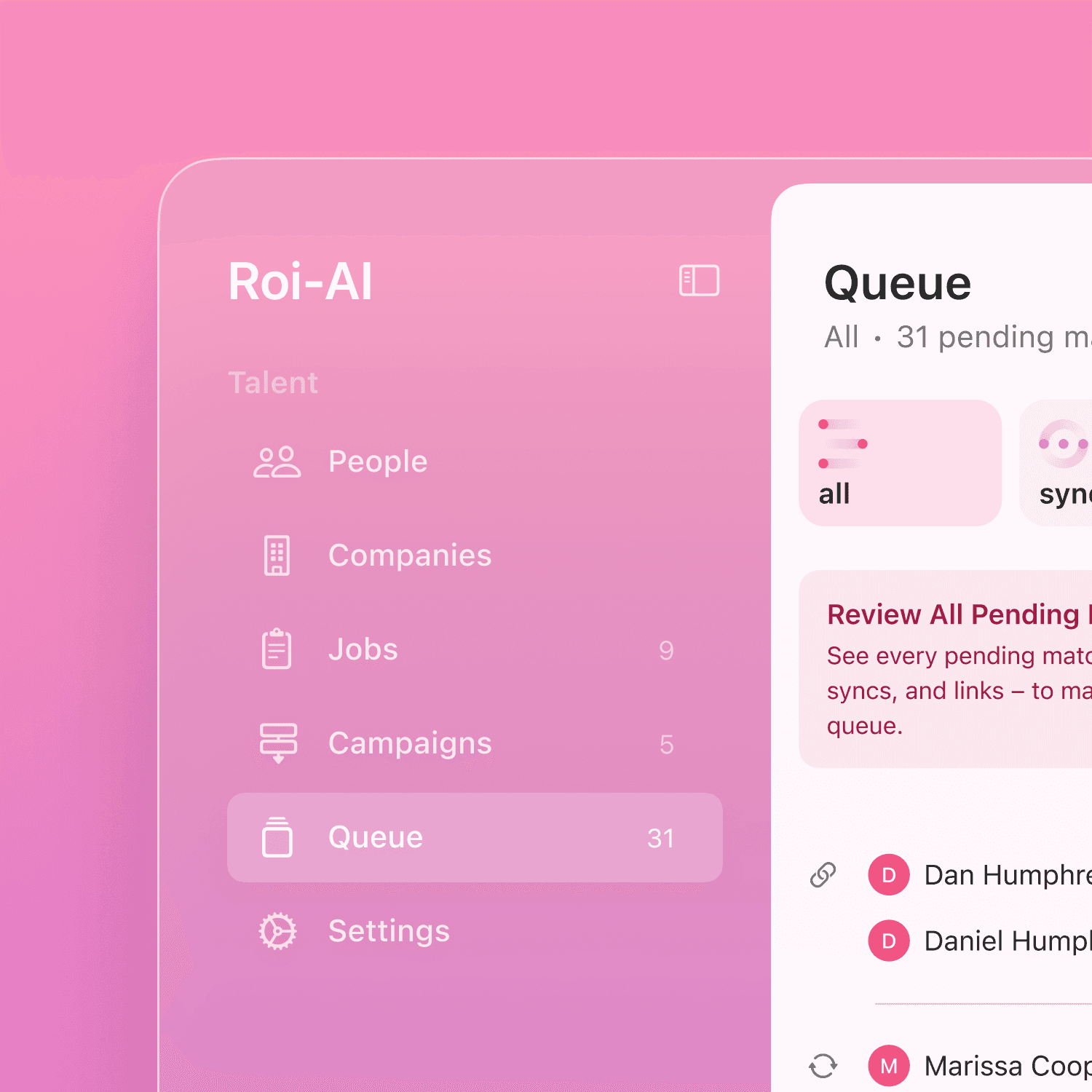 Recruiters can view all pending syncs, duplicates and links that require their approval, or easily filter out just one type of match.
